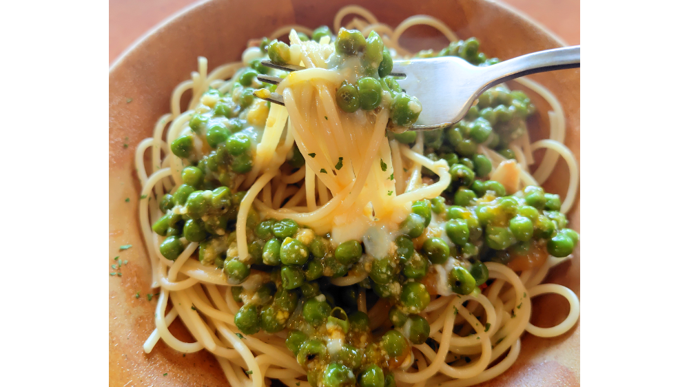 ベースのペペロンチーノのガーリックとオリーブオイルの風味がしっかり効いた塩気と旨味に、青豆が持つ優しい甘みとホクホク感が加わることで、味がまろやかに、そして奥深くなります。