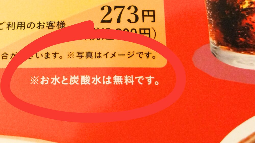 サイゼリヤでは「シロップを混ぜないもの=水と同等」という太っ腹な解釈をしてくれているため、炭酸水も無料で提供されていることが多いのです。