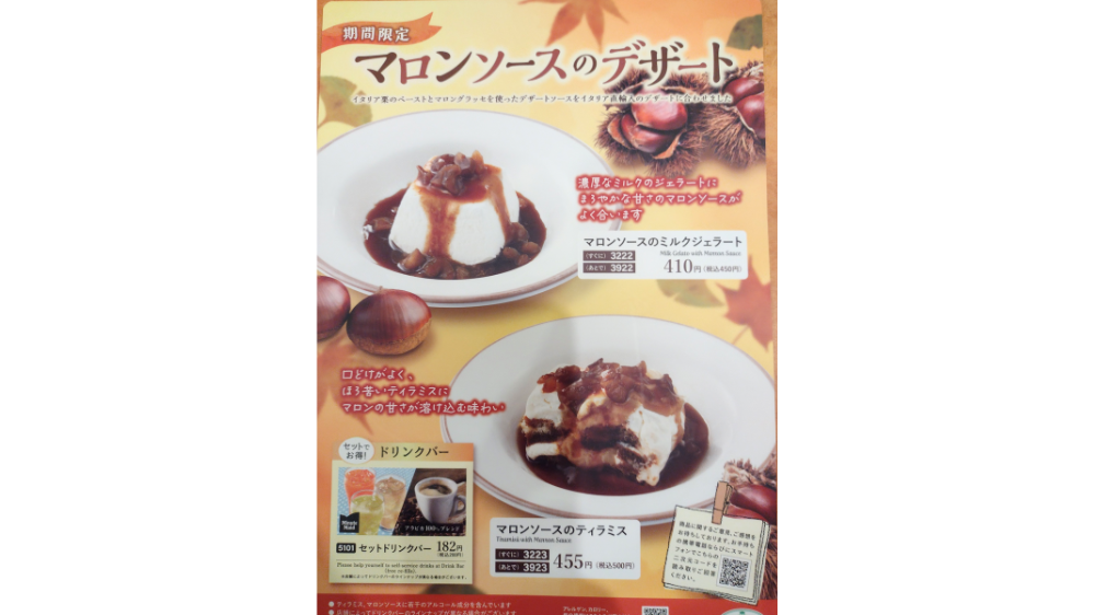 サイゼリヤで期間限定「マロンソースのデザート」が一部店舗で販売されていましたので、特徴や実際に食べてみた感想を詳しく紹介します。